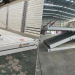 Las paredes laterales están fabricadas en panel sándwich de acero y espuma aislante de alta densidad, diseñadas para abatirse hacia el interior sin comprometer la estanqueidad. El sistema de bisagras ocultas permite un plegado limpio, mientras que los perfiles de unión y las juntas de goma garantizan un cierre sin filtraciones una vez montado. Estas paredes soportan el aislamiento térmico y acústico del módulo.