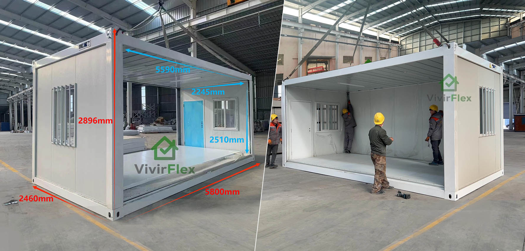 El contenedor plegable ofrece un aislamiento térmico mediante paneles sándwich de 50 mm de espesor, compuestos por chapa galvanizada prepintada y núcleo de espuma de poliuretano expandido. Este sistema proporciona una eficiencia energética adecuada para climas templados y cálidos, manteniendo una temperatura interior confortable y reduciendo el consumo energético.